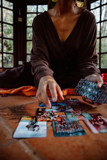 The Egyptian Gods Oracle Cards are a powerful tool for seeking guidance on specific life questions. Whether you’re navigating career decisions, relationships, or personal growth, the guidebook provides insights to help you interpret the cards’ symbolism and prophetic keywords. Use the cards to uncover hidden patterns, gain clarity, and align with the wisdom of Egyptian deities. For example, draw a card for insight into a challenging situation or use a spread to explore different aspects of your question. This practice deepens your connection to the cards and enhances their relevance to your life’s journey.
